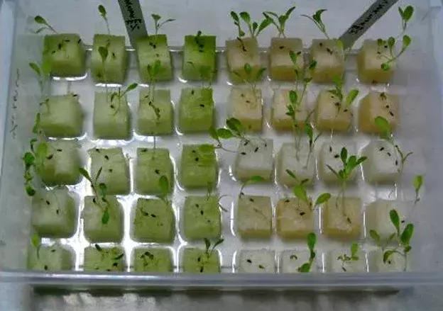 海綿塊播種一般葉類菜在2.5~3.0cm見方上的海綿塊上播種,播種深度在兩倍種子寬度為宜。由于海綿滲水快,所以在種子發(fā)芽出苗階段一定要看好水分,水分太低不足以發(fā)芽出苗,水分太高容易爛種。